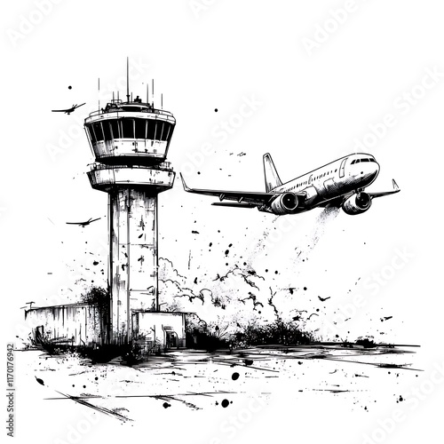 Air Traffic Control Tower and Airplane Taking Off A Black and White Ink Illustration.