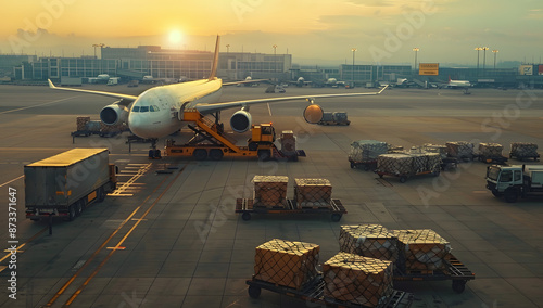 Airborne Efficiency: Aerial View of Cargo Unloading at the Airport