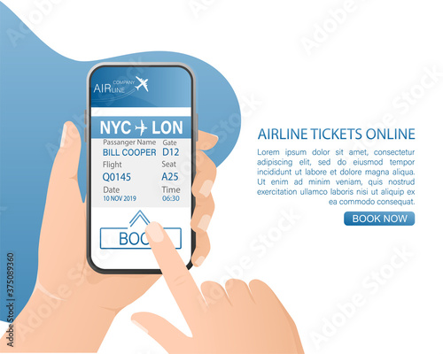 Airline tickets online with hands and smartphone in flat style. Isolated vector illustration.