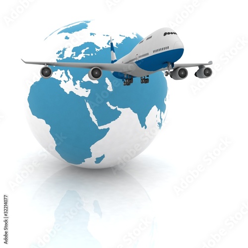 airliner with a globe in the white background