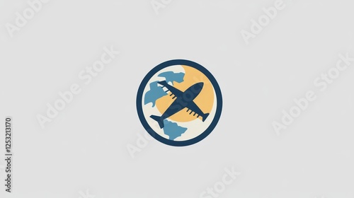 Airplane icon on circular background, simple design, travel, world map