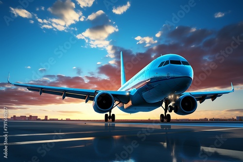 Airplane on the runway with blue sky background. 3d rendering