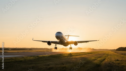 Airplane Taking Off on Runway During Sunset with Dust Cloud and Warm Sky