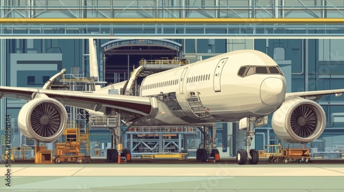 Airplane undergoing maintenance in a large hangar with industrial equipment and tools