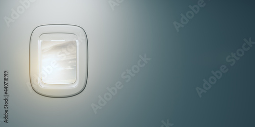 Airplane window with beautiful sky view and mock up place for your advertisement. Travel and transportation concept. 3D Rendering.