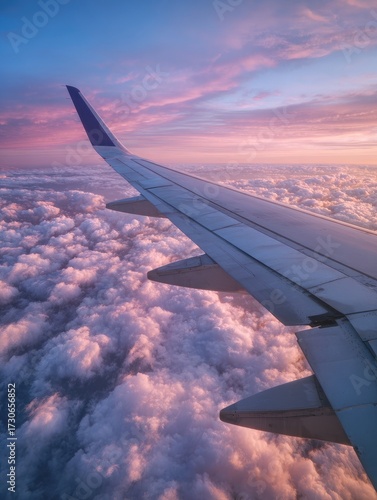 Airplane wing above a vast expanse of fluffy clouds bathed in the soft hues of a breathtaking sunset, displaying a vibrant array of pink, purple, and orange tones in the sky
