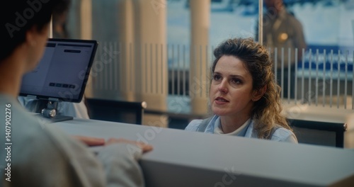 Airport Check-in Counter: Female Airline Check-in Attendant Talking to Passenger, Asking Questions During Passport Check for Boarding Flight. Security Checkpoint in International Airport Terminal.
