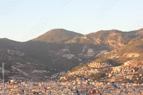 Alanya, TURKEY - August 10, 2013: Travel to Turkey. Helene Hills. Mountains in the background in the distance. Rocks, wildlife of Turkey. Forest and clear blue sky. Mediterranean Sea.