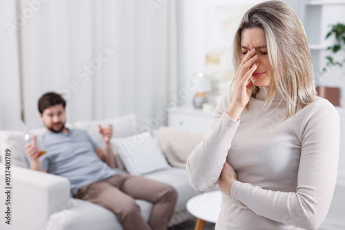 Alcohol addiction. Drunk man with whiskey on sofa at home, focus on his unhappy wife