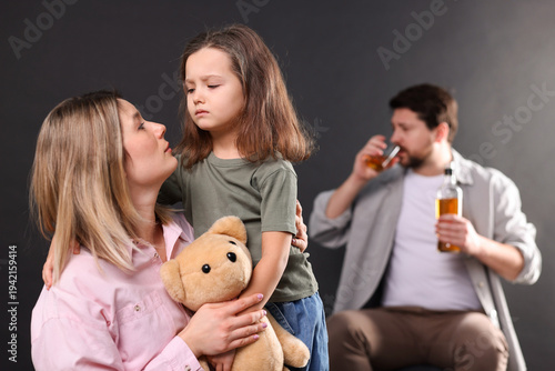 Alcohol addiction. Man drinking whiskey on dark background, focus on his unhappy wife and daughter with toy bear