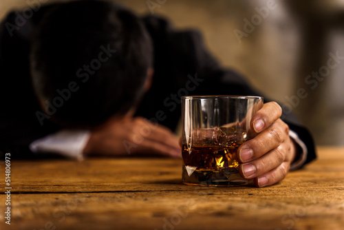 Alcoholism, depressed asian young man sleep on table while drinking alcoholic beverage, holding glass of whiskey alone at night. Treatment of alcohol addiction, suffer abuse problem alcoholism concept