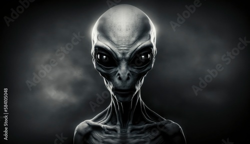 Alien humanoid portait on dark background. Invasion of extraterrestrial. Alien abduction. Created with Generative AI