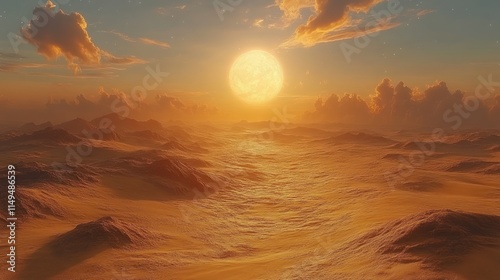 Alien landscape, sunset, large sun, orange sky.