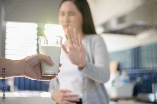 Allergy dairy food lactose intolerance allergen health care illness concept. Selective focus on a glass of milk with blurred woman gesturing refusing stop or reject say no to cow milk.