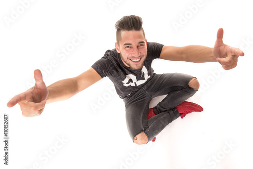 Alles klar man - Cooler Typ sitzt und zeigt mit den Fingern - freigestellt