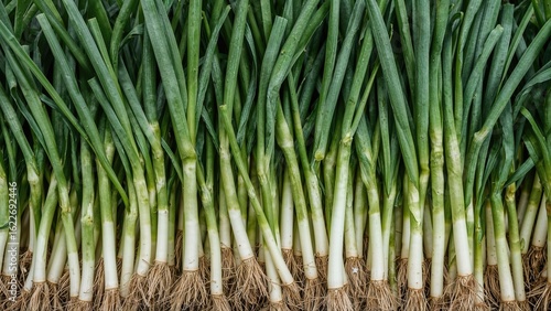 Allium family plants featuring white roots and stems with vibrant green tops including scallions and leeks