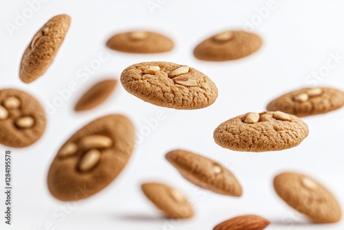 Almond cookies falling against a white background