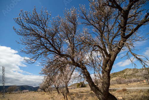 Almond trees in blossom fields in Teruel Aragon Spain