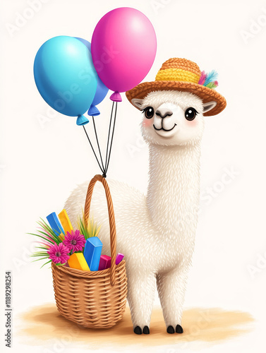 Alpaca Balloon Hat Basket Summer Fun - A cute alpaca wearing a straw hat, carrying colorful balloons and a picnic basket, symbolizes joy, adventure, summer, friendship, and celebration.