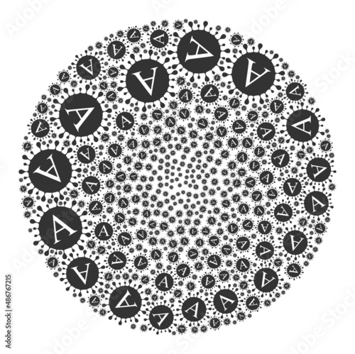 Alpha coronavirus symbols are scattered into round collection. Alpha coronavirus icon round mosaic. Abstraction sphere bubble mosaic done from Alpha coronavirus symbols.
