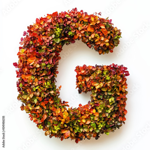 Alphabet letter G made of fall leaves, flowers. berries. Vibrant autumn colours. White clean background. Generative AI