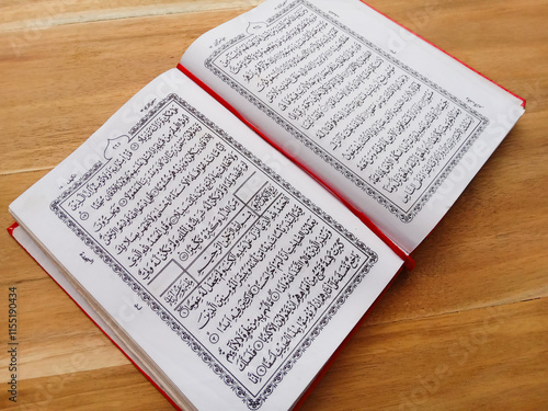 al-Qur'an on wooden background. The Islamic holy book, lies open on the table