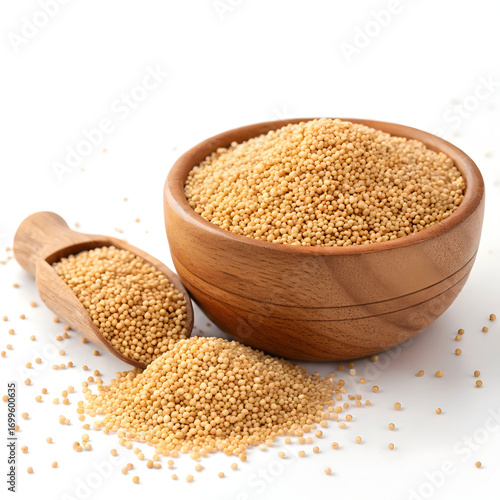 Amaranth grains beautifully displayed in a rustic wooden bowl, isolated on a clean white background,
