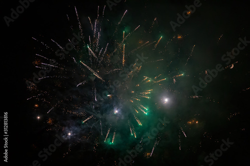 Amazing green fireworks on night sky. New years eve celebration. Ceske Budejovice, Czech republic