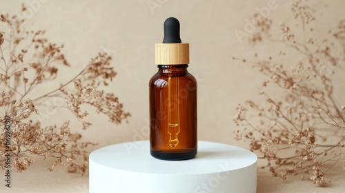 Amber Glass Dropper Bottle Displayed on White Pedestal