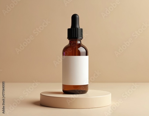 Amber glass dropper bottle mockup with blank label. Cosmetic product branding template on beige platform. Skincare essential oil product presentation against neutral background.