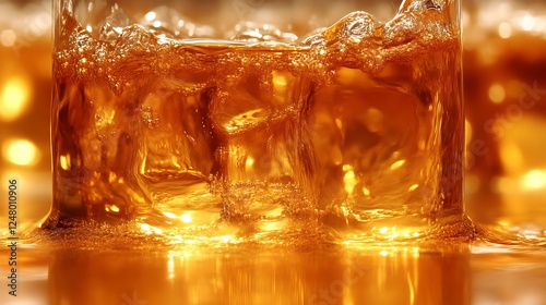 Amber Liquid Swirling in a Glass with Ice Cubes