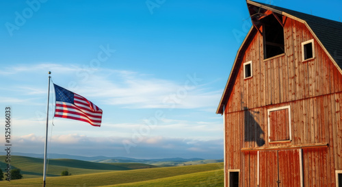 American Flag Waves Over Rolling Hills and Rustic Red Barn at Sunrise