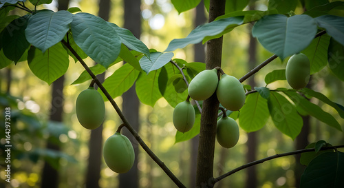 American Pawpaw Tree with Green Fruit Hanging from Branches in Forest