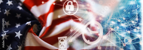 American striped flag and a stack of one hundred dollar bills. Financial center of the world.