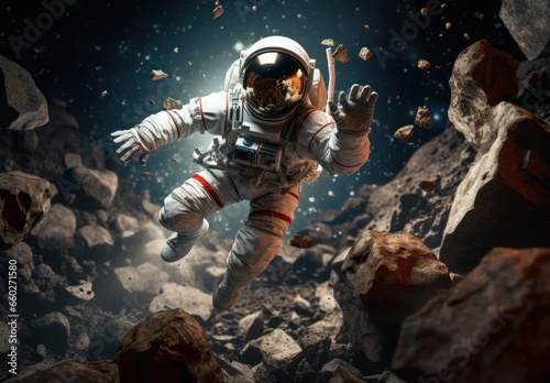 Amidst the vastness of space, a lone astronaut stands tall in their helmet, gazing at the majestic mountains in the distance, contemplating the raw power and beauty of the universe