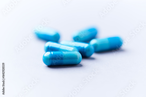 Amino acids capsules on bright background. Soft focus. Close up. Copy space.