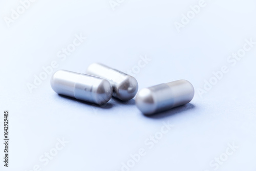 Amino acids capsules on bright background. Soft focus. Close up. Copy space.