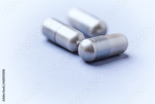 Amino acids capsules on bright background. Soft focus. Close up. Copy space.