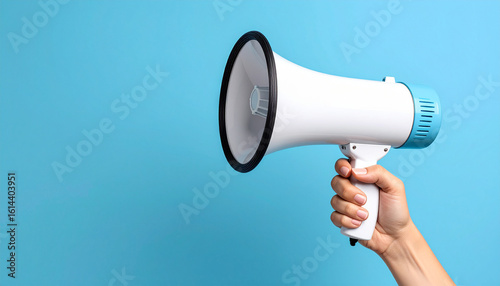 Amplified Announcement: A hand firmly grasps a sleek megaphone against a vibrant blue backdrop, ready to project a message clearly.