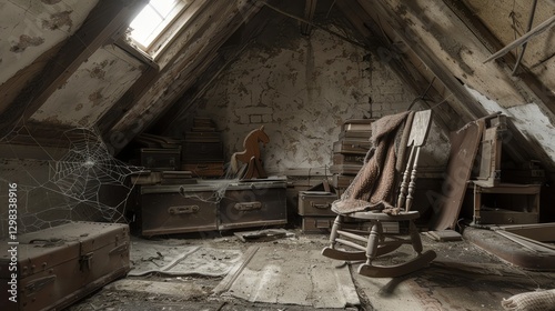 An abandoned attic with dust, cobwebs, and forgotten furniture.