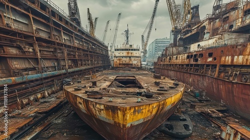 An abandoned shipyard with rusting vessels and cranes in a desolate setting.