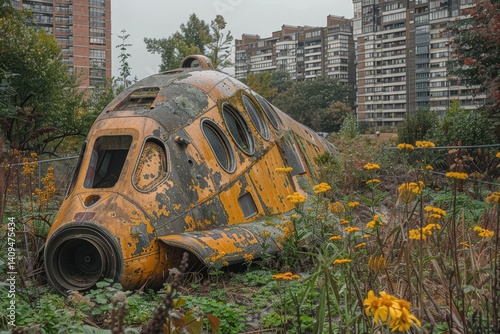 An abandoned structure of a yellow spacecraft lies in nature