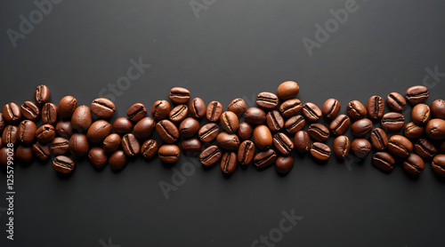 An abstract composition of coffee beans creating a precise line on a matte black background captures texture and contrast