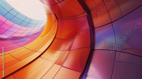 An abstract image showcasing curved panels in shades of red, orange, and purple, creating a modern and futuristic aesthetic.