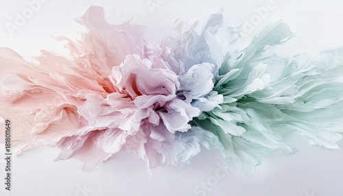 An abstract, organic form resembling a flower or explosion of petals, transitioning from soft pinks and purples to pale blues and greens against a clean white b