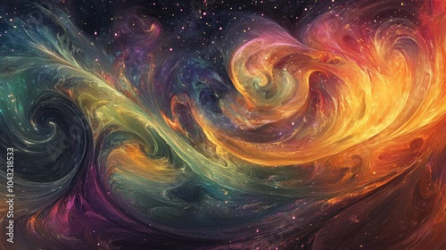 An abstract representation of a cosmic storm with dynamic swirls of colors and sparkling stars throughout.