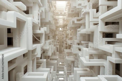 An abstract space with chaotic and complex geometric shapes intertwined, creating an intriguing and visually captivating environment. Photorealistic illustration