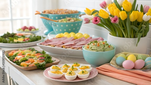An abundant Easter buffet with deviled eggs, fresh salads, pastries, and pastel Easter eggs, arranged on a beautifully decorated table.