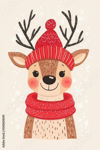 An adorable and festive depiction of a cute Christmas deer wearing a hat and scarf