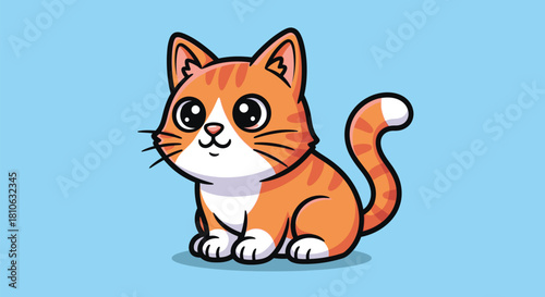 An adorable cartoon ginger tabby cat with large, cute eyes sitting happily on a light blue background.